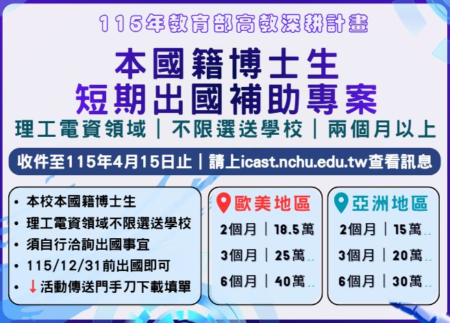 115年教育部高教深耕計畫補助本國籍博士生短期出國補助專案開跑囉!!!